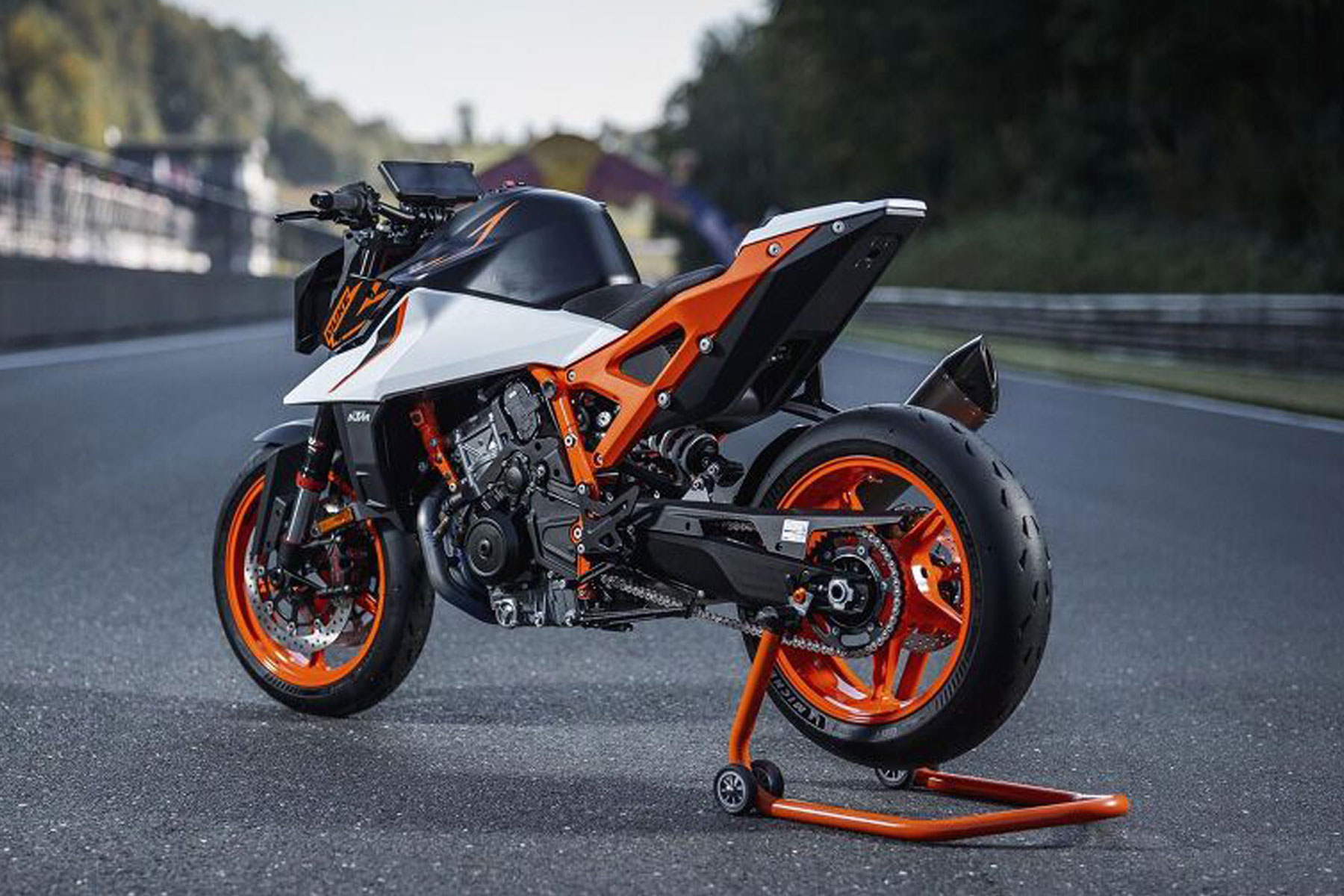Die KTM 990 Duke R 2025 ist serienmäßig mit dem Michelin Power Cup 2-Reifen, der - zumindest bei trockenen Bedingungen - bereits bei der Vorgängerin für Grinsen unterm Helm gesorgt hat, ausgestattet. In Kombination mit den leichten markanten, orangefarbenen Felgen (hinten in der Breite 180 statt 200) aus der KTM 1390 SUPER Duke R für dürften sie für hervorragende Traktion sorgen.