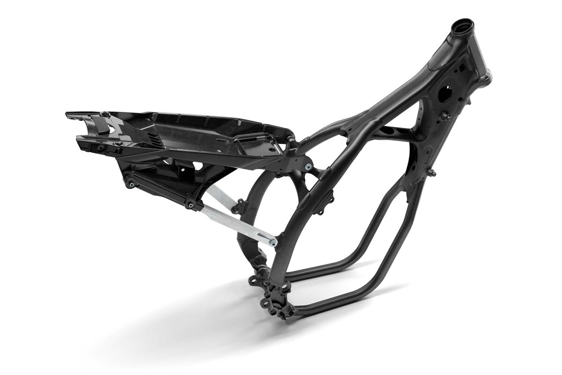 Am deutlichsten zu erkennen sind die Neuerungen am Rahmen, der nun über sichtbare Aussparungen und Änderungen an der Rohrwandstärke um die Frontpartie, die Motoraufhängungen und die hintere Stoßdämpferbefestigung herum verfügt. Diese Änderungen sind insbesondere darauf ausgelegt, die Flexibilität des Fahrwerks zu verbessern und das Gewicht um ca. 300 g zu verringern, wobei gleichzeitig die Gesamtstabilität aufrechterhalten und das Kurvenverhalten verbessert wird. Die überarbeitete Schwinge mit gefrästem Kettengleiter und das erneuerte Hinterradbremspedal runden die Neuerungen am Rahmen ab.